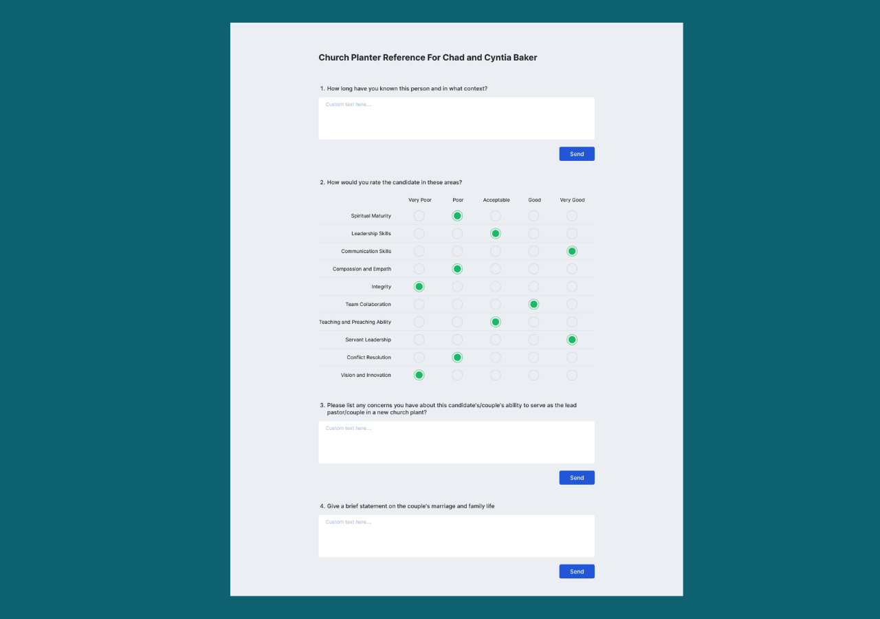 Say goodbye to managing candidates with sticky notes, spreadsheets, or endless email chains. See below some example PlanterPathway interfaces, designed to help you systematically follow up with potential church planters and missionaries. Remember, these interfaces can be customized to track the specific information relevant to your assessment process and align with your organization's goals.